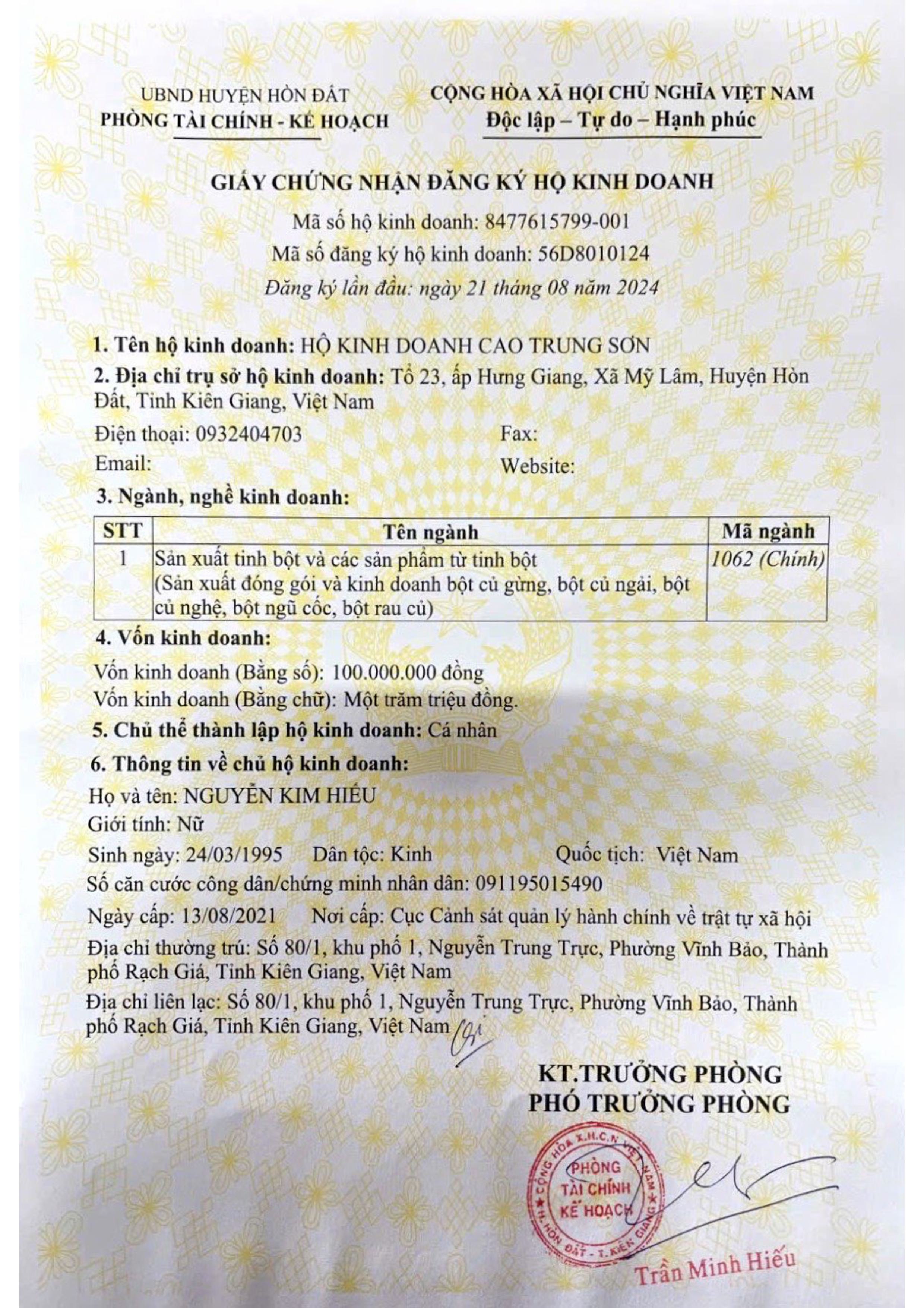 Hộ kinh doanh Cao Anh Trung được chính thức thành lập và đăng ký kinh doanh vào ngày 24 tháng 11 năm 2022, với giấy phép kinh doanh số: 56A8028798. Từ những ngày đầu, doanh nghiệp đã tập trung sản xuất các sản phẩm từ củ ngải như Bột Cao Trung Sơn và Viên uống Cao Trung Sơn. Những sản phẩm này không chỉ được người tiêu dùng đánh giá cao về mặt chất lượng mà còn có hiệu quả trong việc chăm sóc sức khỏe tổng thể.