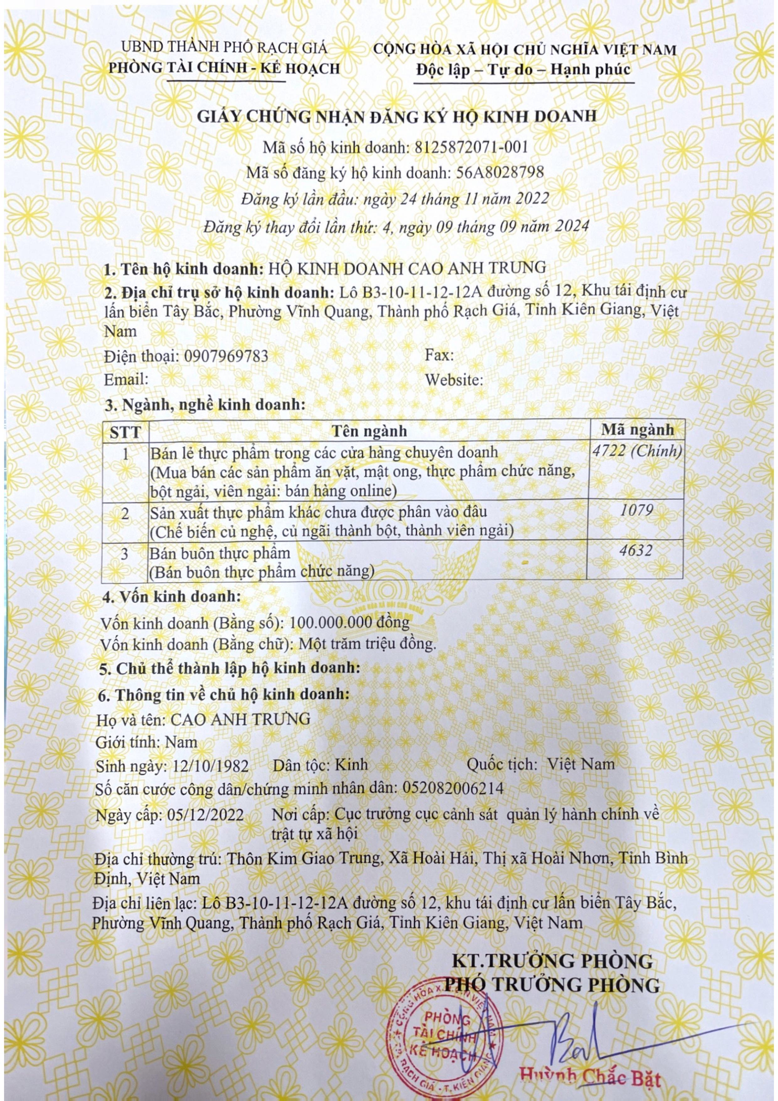 HKD Cao Anh Trung cam kết không chỉ mang lại sản phẩm chất lượng cao, mà còn hướng đến sự chăm sóc sức khỏe toàn diện cho cộng đồng. Với đội ngũ giàu kinh nghiệm và tâm huyết, chúng tôi luôn đặt lợi ích sức khỏe của người tiêu dùng lên hàng đầu.