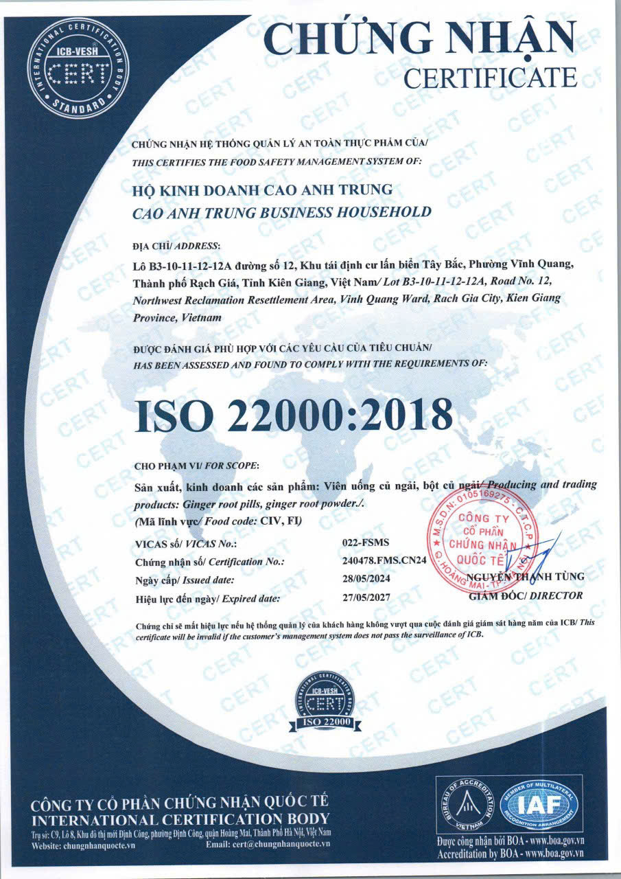 Chứng nhận ISO 22000:2018 là tiêu chuẩn quốc tế đánh giá mức độ an toàn trong quy trình sản xuất và kinh doanh thực phẩm. Việc đạt được chứng nhận này là minh chứng cho sự tuân thủ nghiêm ngặt của HKD Cao Anh Trung đối với các quy chuẩn quốc tế về an toàn thực phẩm, đảm bảo sản phẩm từ viên uống củ ngải đến bột củ ngải đều đạt chất lượng cao nhất trước khi đến tay người tiêu dùng.