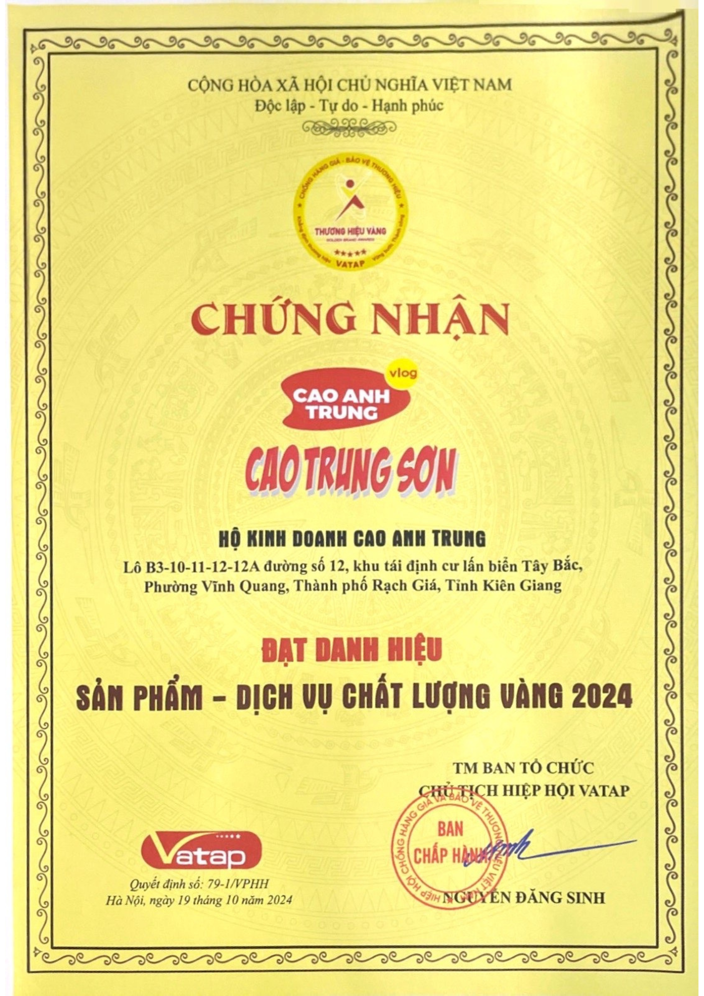 SẢN PHẨM CAO TRUNG SƠN VINH DỰ ĐẠT CHỨNG NHẬN: SẢN PHẨM - DỊCH VỤ CHẤT LƯỢNG VÀNG 2024