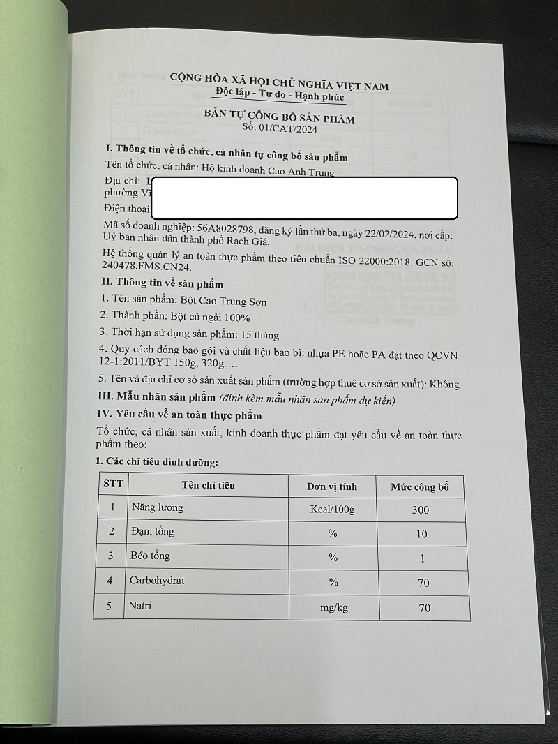 Kết quả xét nghiệm Bột Cao Trung Sơn