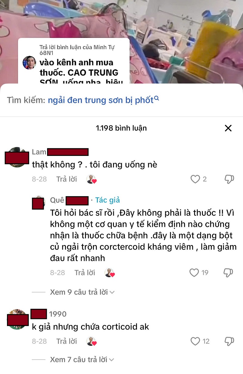 Nịck ảo này và một nhóm nick tài khoản ảo khác, liên tục tạo thêm những bình luận, comment về sản phẩm, khẳng định rằng Cao Trung Sơn có Corticoid liều mạnh cho nhiều khán giả xem bình luận, cùng hoan man tâm lý.
