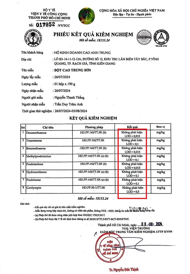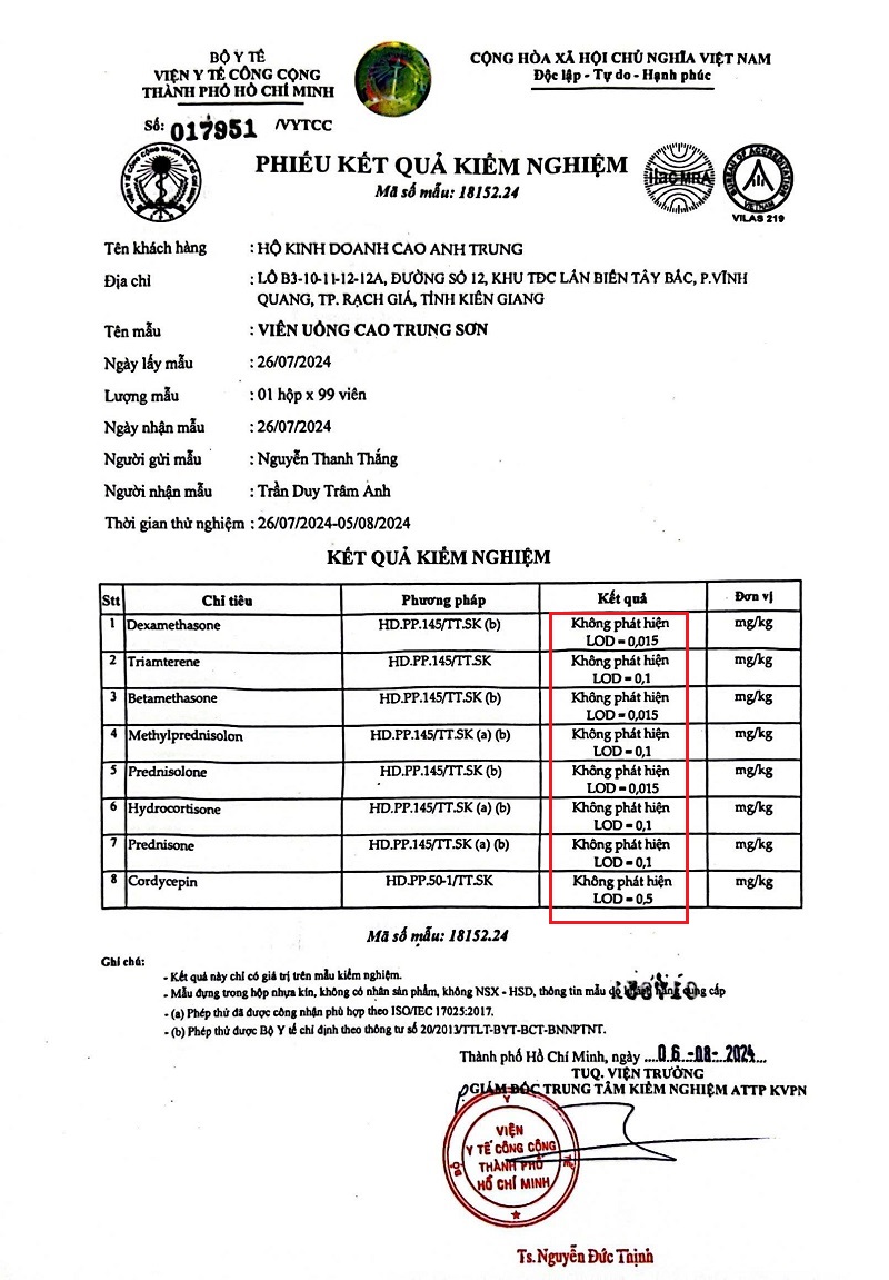 Dưới đây là file xét nghiệm mới nhất trong tháng 8/2024 và có xác nhận mộc đỏ (tròn) của Viên Y tế Công Cộng TP.HCM thuộc Bộ Y Tế về sản phẩm bột và viên Cao Trung Sơn. Quý cô chú anh chị tham khảo.